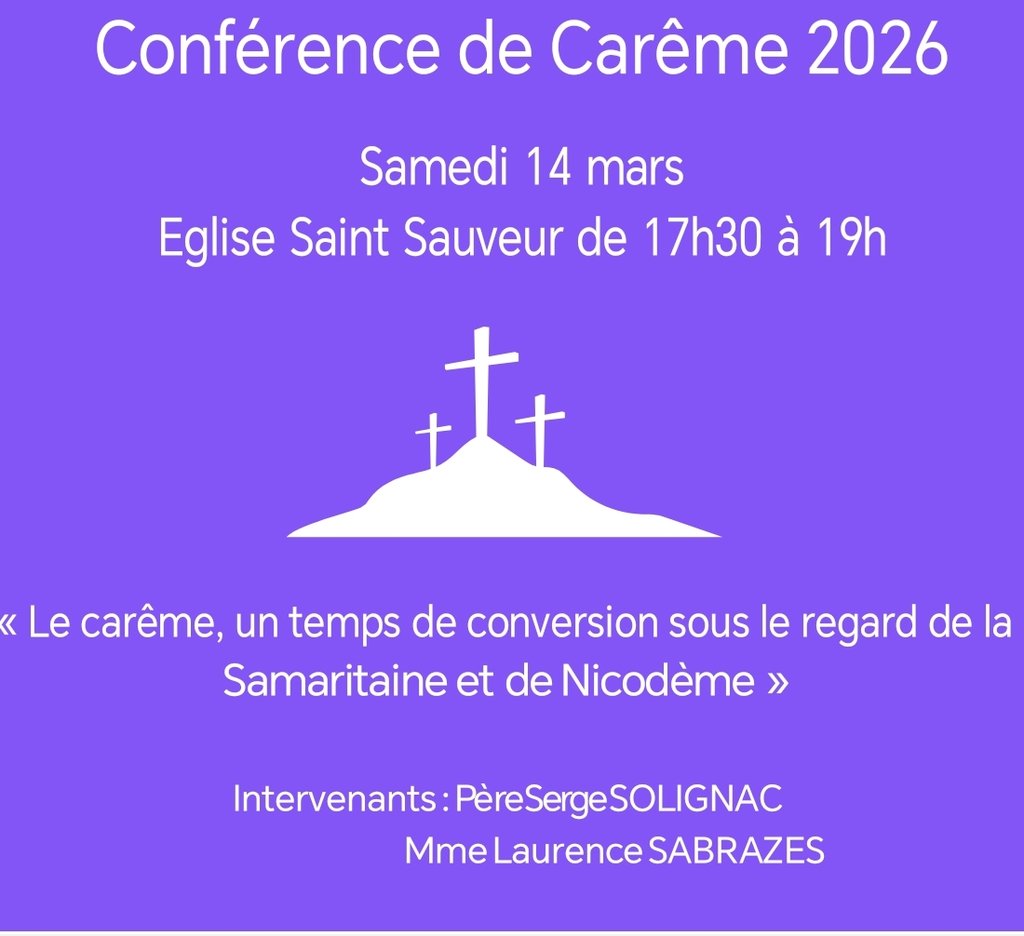 L'Ensemble paroissial de Castelsarrasin - La Ville-Dieu-du-Temple vous invite à la Conférence de Carême 2026, qui aura lieu le samedi 14 mars en l'église Saint Sauveur de Castelsarrasin à 17h 30, sous le thème : " Le Carême, un temps de conversion sous le regard de la Samaritaine et de Nicodème".
